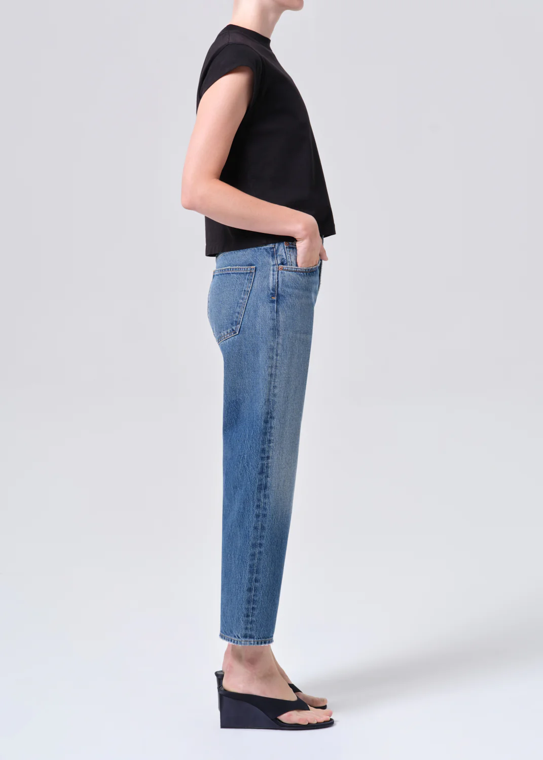 An updated take on a best-selling favorite, the 90’s Crop Jean offers a relaxed vintage-inspired fit with a modern cropped inseam. Designed in a medium classic washed indigo, this mid-rise style sits easy at the waist and falls into a loose straight leg for an effortlessly laid-back silhouette. Crafted from non-stretch regenerative cotton denim with a soft hand feel, it provides all day comfort while maintaining its authentic denim structure.