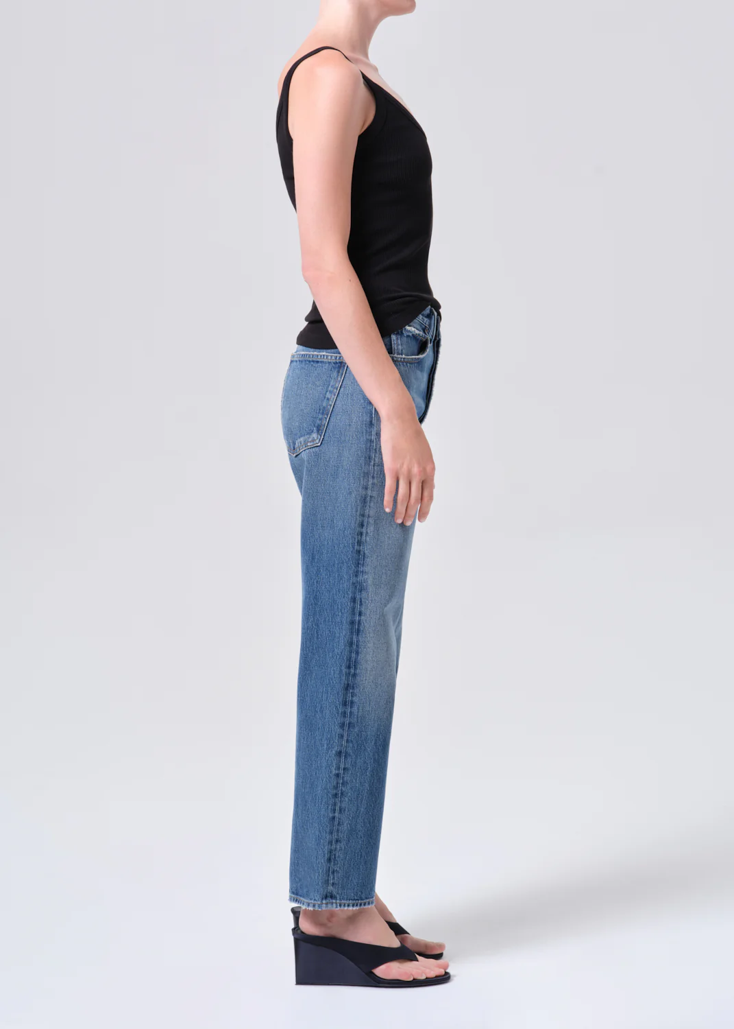 A timeless, relaxed silhouette in a medium classic washed indigo. This mid-rise jean sits comfortably at the waist with a loose fit through the thigh that extends into a straight leg for an easy, laid-back shape. Crafted from rigid non stretch cotton denim with a soft hand feel, it offers all day comfort while keeping its clean, structured finish. Pair it with a crisp white tee and leather sandals for an understated look, or style with a lightweight blazer for effortless polish.