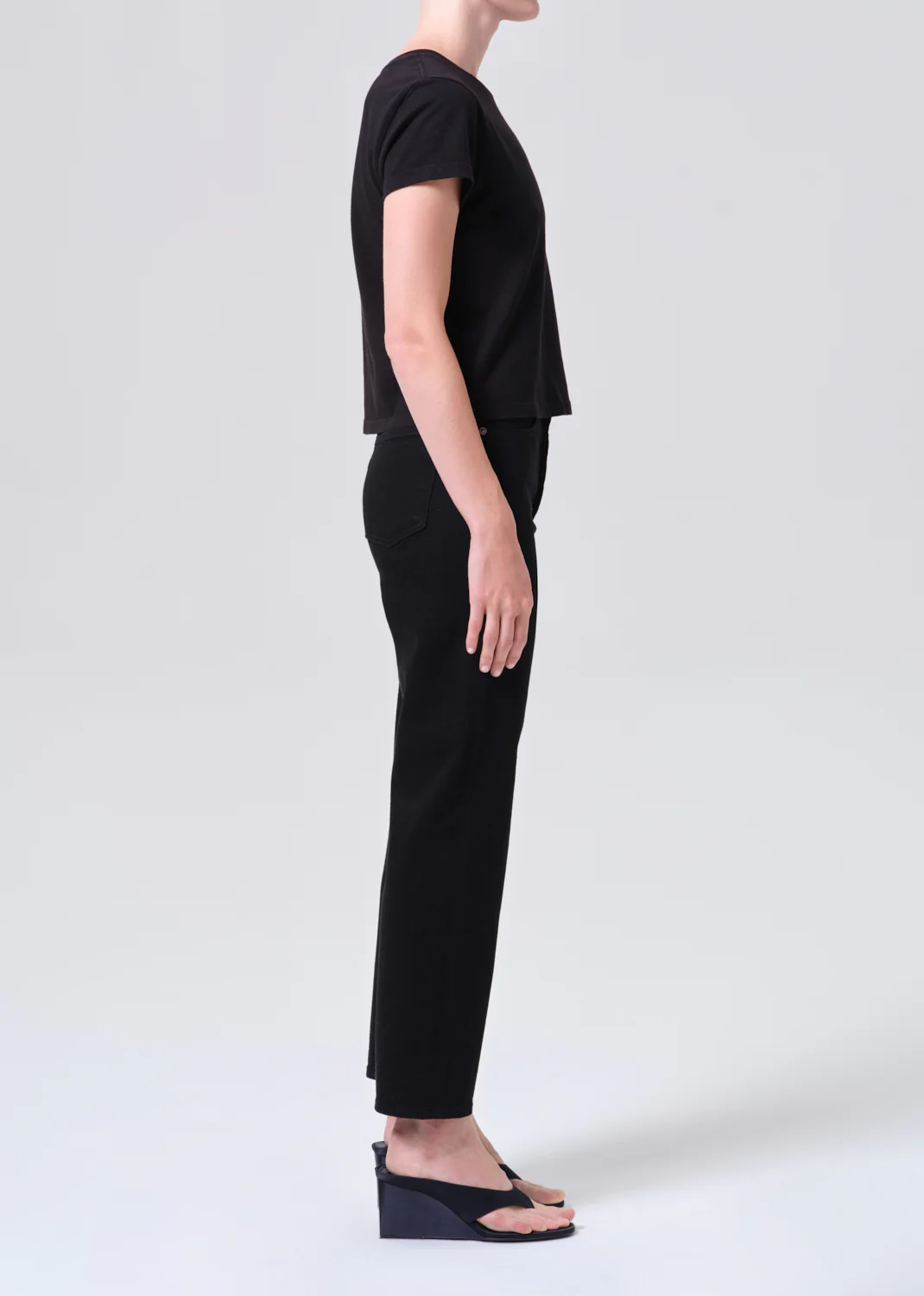 The 90’s Pinch Waist Crop in Cover revives a vintage-inspired silhouette with a modern, refined edge. Crafted from heavyweight regenerative cotton denim with comfort stretch, this high-rise straight style features a cropped 27.5" inseam and clean overdyed black finish. Soft to the touch and structured to hold shape, it's an everyday essential with all-day wearability.