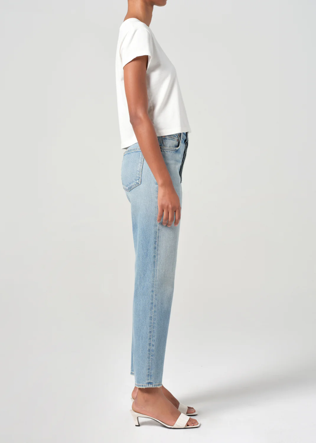 If you love the Riley, you will love our 90's Pinch Waist Crop. It inspired by two of our best-selling styles. Featuring a flattering high-rise waist with a close-fitting top block through the hips, an easy, classic straight leg finished with a cropped inseam.